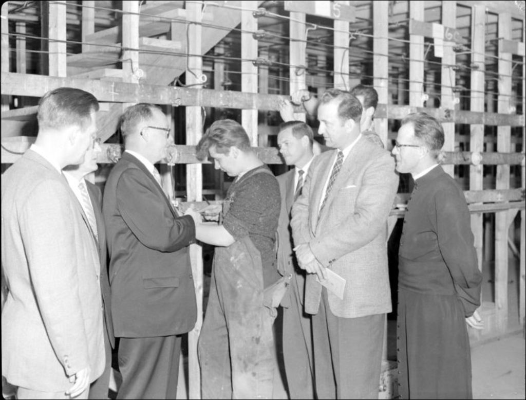Visite de ministres au Centre d'apprentissage des métiers de la construction de Montréal, [195-?], Archives nationales à Montréal, Fonds Ministère de la Culture et des Communications, (06M,E6,S7,SS1,D217837-217837), Jean Pratte.
