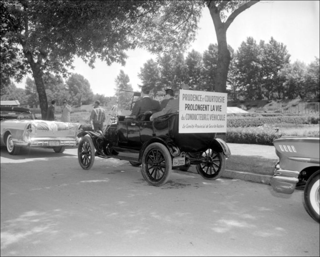 - Une affiche portant la mention «Prudence et courtoisie prolongent la vie du conducteur et du véhicule» est fixée sur une automobile. Scènes photographiées pour M. J. L. Dyotte