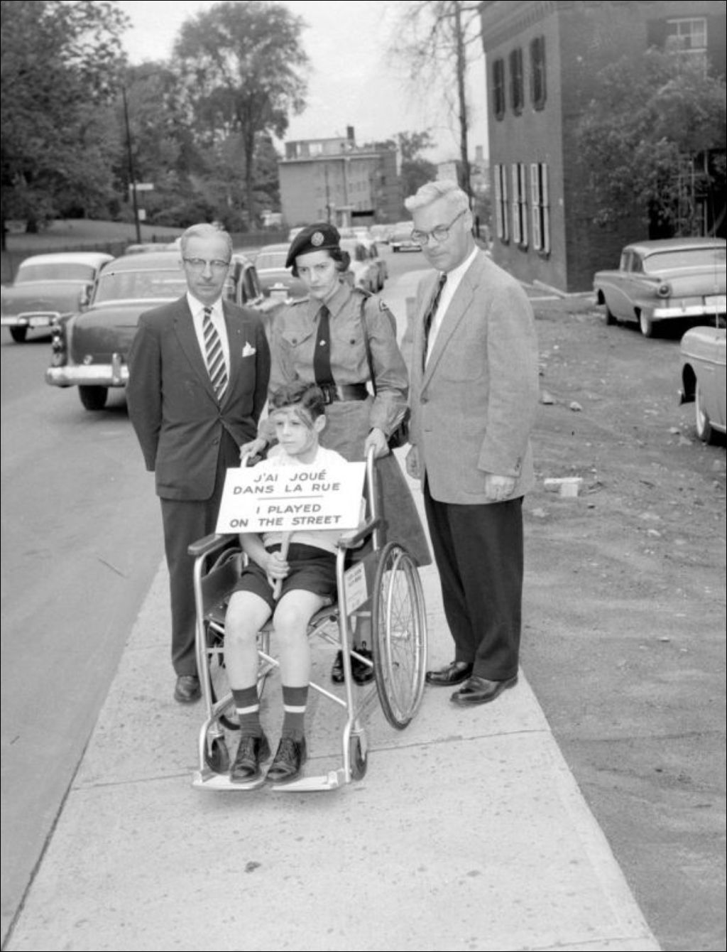 - Des membres de l'Ambulance Saint-Jean poussent des garçons en fauteuil roulant. Ceux-ci montrent des affiches sur lesquelles sont inscrites les mentions suivantes: «J'ai joué dans la rue» et «J'ai traversé entre 2 intersections». Reportage commandé par M. J. L. Dyotte