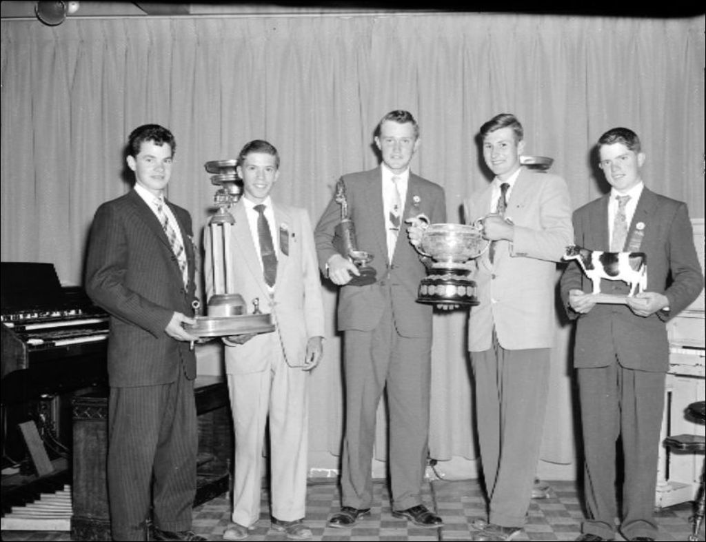 - Dans un aréna aménagé pour la foire agricole, des juges évaluent les bovins. Les gagnants de la compétition sont photographiés en compagnie des organisateurs de l'exposition et de Maurice Richard, joueur du club de hockey Canadien. Des clichés d'un banquet complètent le dossier. Reportage réalisé pour M. MacMillan