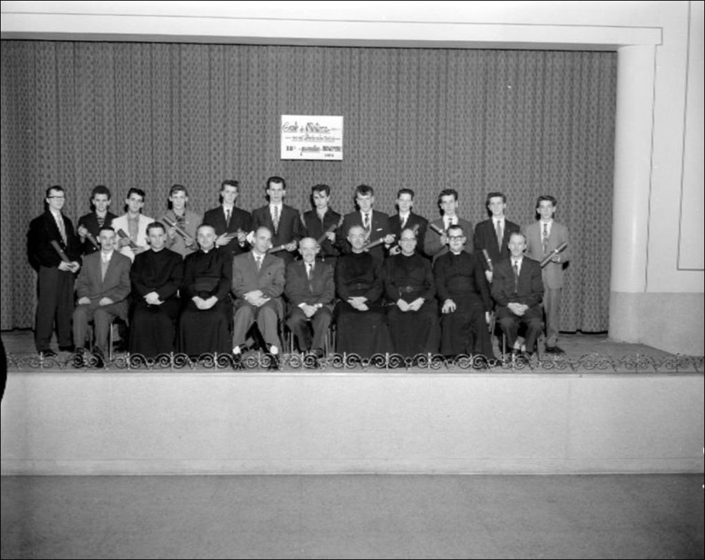 Ministère du Bien-être social et de la Jeunesse. Collation des grades pour les finissants de l'École des arts et métiers du Mont-Saint-Antoine, située au 7945 rue Sherbrooke Est, Montréal, novembre 1958, Archives nationales à Montréal, Fonds Ministère de la Culture et des Communications, (06M,E6,S7,SS1,D220733-220735), Paul Girard.