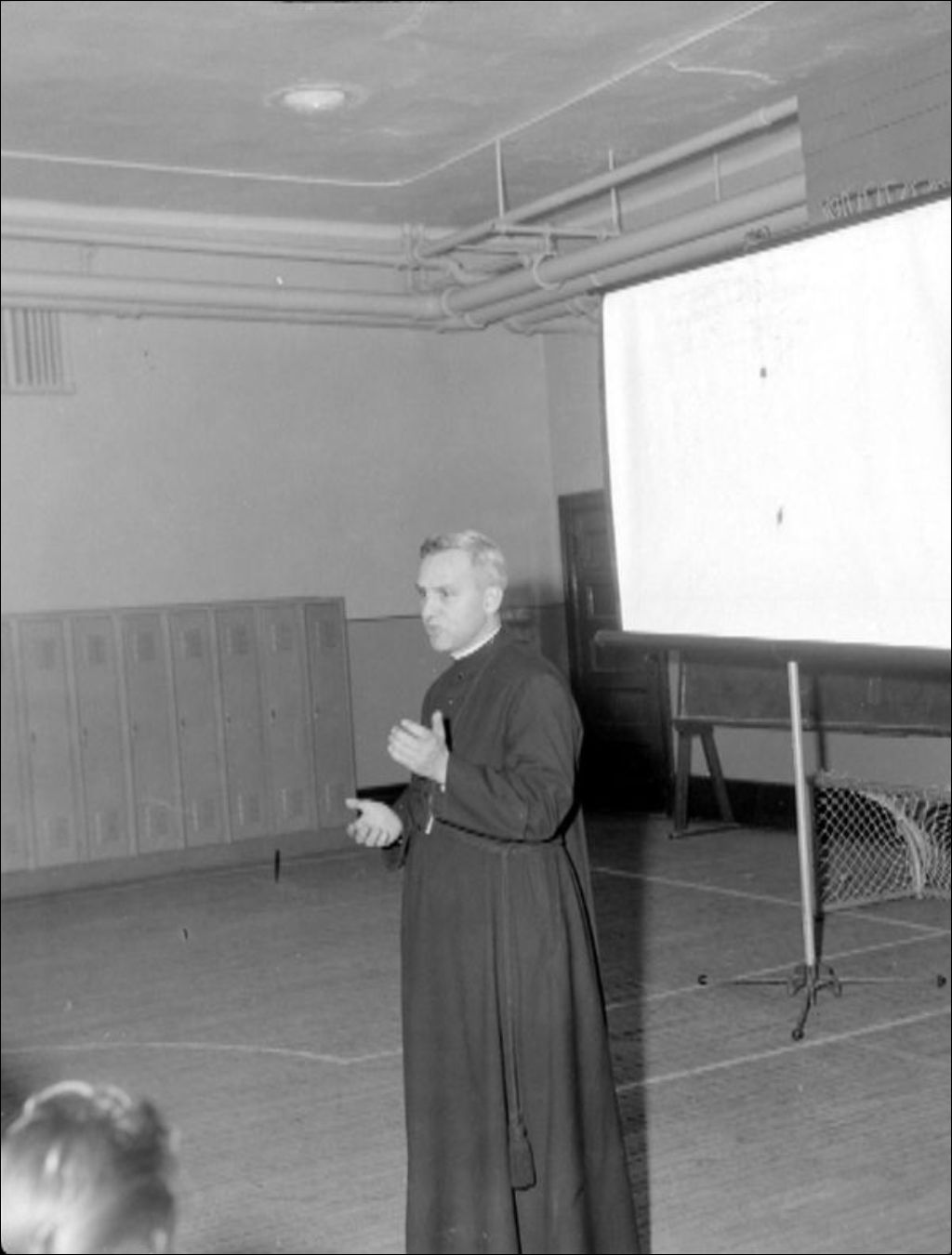 Un ecclésiastique prononce un discours devant des étudiants rassemblés dans un gymnase. Reportage réalisé pour Maurice Levac