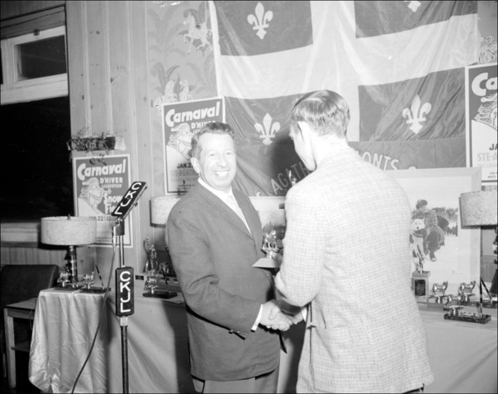 Office provincial de publicité. Remise de prix aux gagnants de la course de traîneau à chiens du carnaval d'hiver de Sainte-Agathe, Sainte-Agathe-des-Monts
