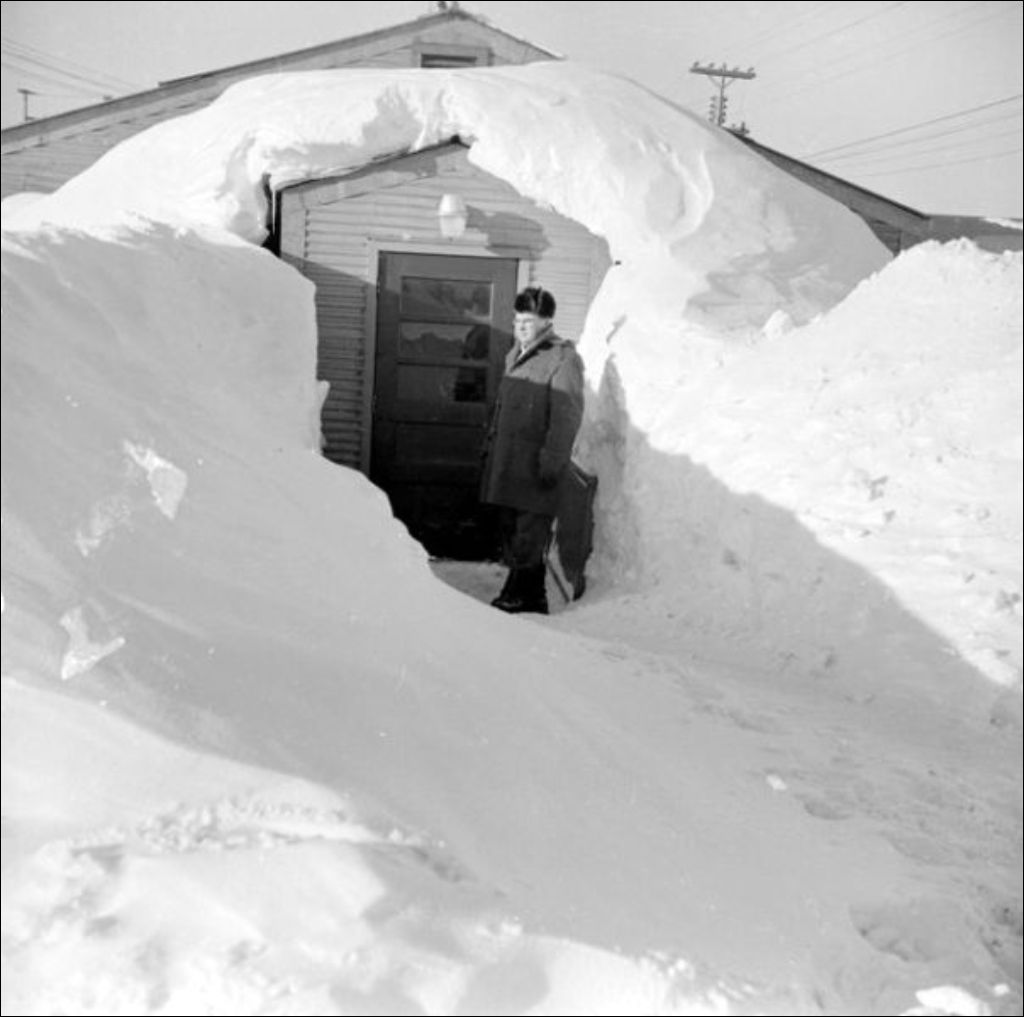 Des clichés présentent des accumulations de neige dépassant le toit des maisons. À ces images s'ajoutent celle d'une caféria où les cuisiniers sont photographiés derrière le comptoir. Photographies réalisées pour M. M. Bertrand