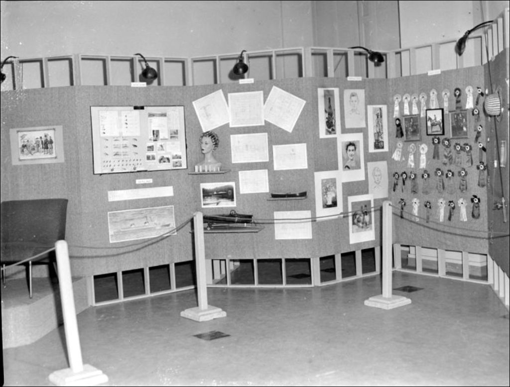 Ministère du Bien-être social et de la Jeunesse. Exposition de dessins, de peintures et de meubles à l'École centrale des arts et métiers, Montréal, [195-?], Archives nationales à Montréal, Fonds Ministère de la Culture et des Communications, (06M,E6,S7,SS1,D221732-221740), Jean Pratte.
