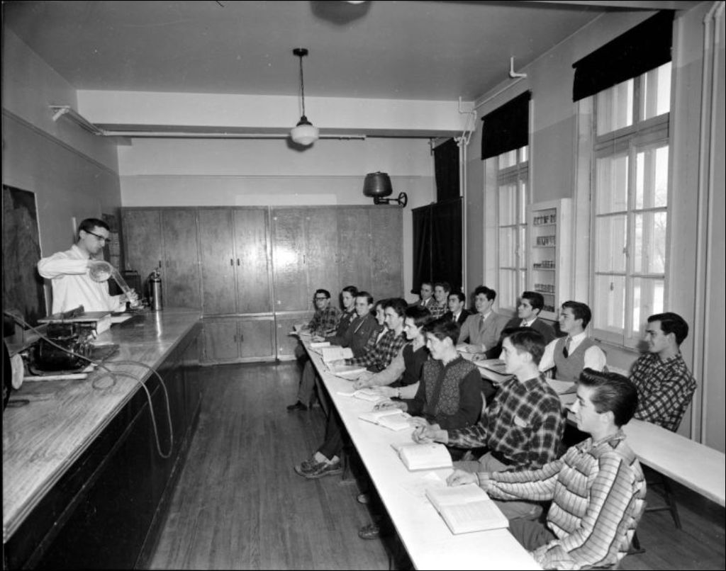 Salle de cours et étudiants de l'École de l'agriculture, Saint-Rémi en Montérégie, [195-?], Archives nationales à Montréal, Fonds Ministère de la Culture et des Communications, (06M,E6,S7,SS1,D221981-221985), Joseph Guibord.
