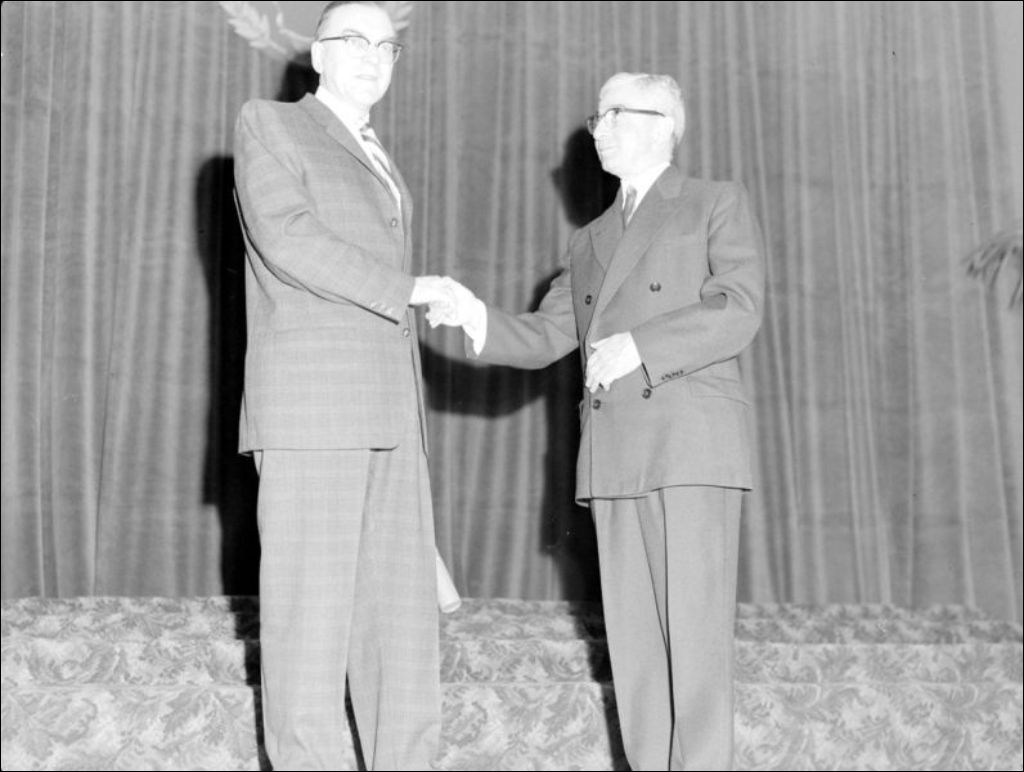 Hommage rendu par la Commission des écoles catholiques de Montréal à M. Wilfrid Du Cap, école Le Plateau située au 3710 rue Calixa-Lavalée, Montréal, Mai 1959, Archives nationales à Montréal, Fonds Ministère de la Culture et des Communications, (06M,E6,S7,SS1,D222405-222410), Gabor Szilasi.