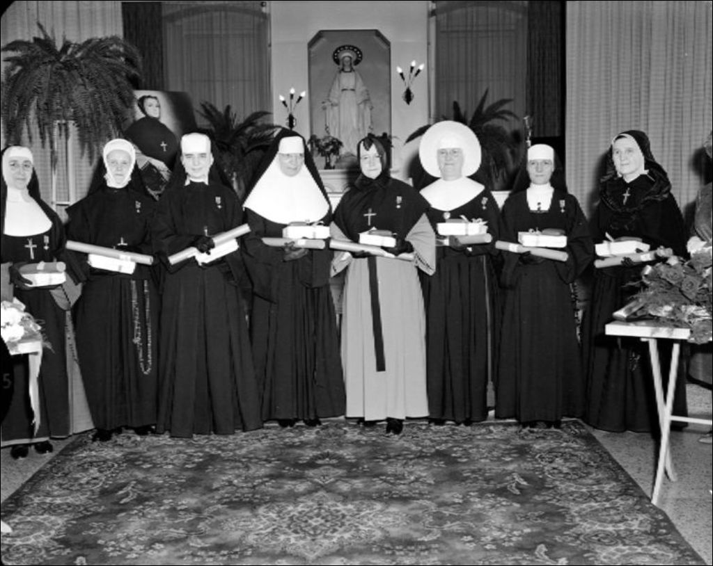 Les Soeurs Grises assistent à une cérémonie au cours de laquelle les professeures des Instituts familiaux sont décorées du mérite scolaire (P222923, P222924). M. Noël reçoit un cadeau à l'occasion de son 25e anniversaire au service des Soeurs Grises (P222925). M. Laurence offre une décoration du mérite scolaire à Mme Cloutier (P222926). Reportage produit pour M. J. A. Noël