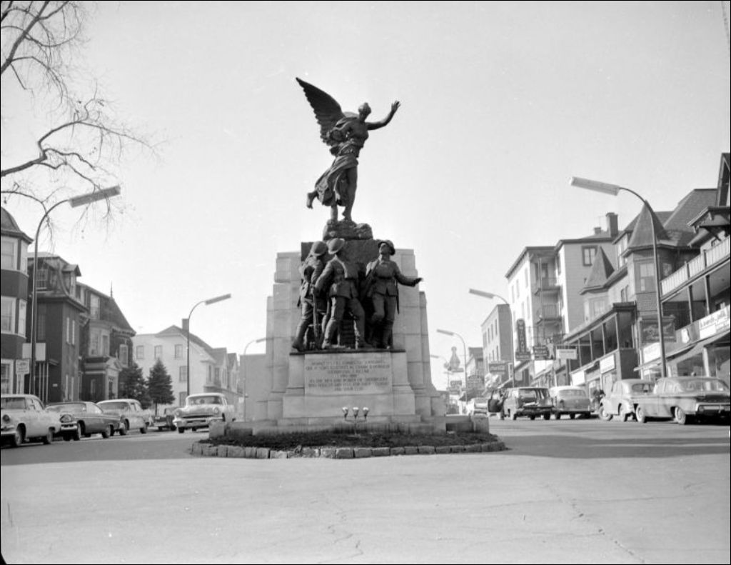 Représentation d'un monument aux soldats décédés lors de la Première Guerre mondiale et d'un officier de la circulation en fonction à l'angle des rues King Ouest et Grandes fourches. Photographies commandées par M. Demers
