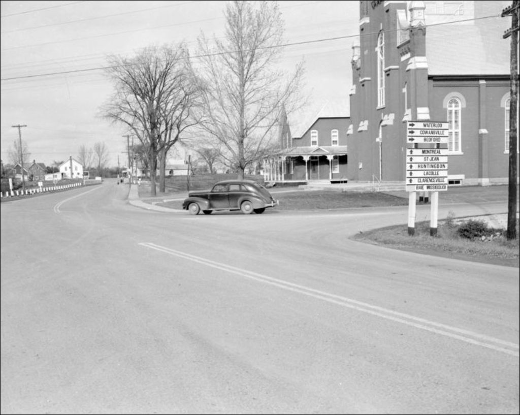 Ministère des Terres et Forêts. Église de Pike River et intersection de la route 202, Pike River en Montérégie, [195-?], Archives nationales à Montréal, Fonds Ministère de la Culture et des Communications, (06M,E6,S7,SS1,D224620-224621), Joseph Guibord.