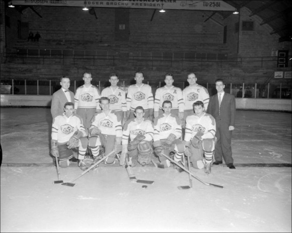 Ministère de la Jeunesse. Photographie de l'équipe de hockey Tech Montréal sur la patinoire de l'aréna de Saint-Vincent-de-Paul (devenue Montréal), 1er février 1960, Archives nationales à Montréal, Fonds Ministère de la Culture et des Communications, (06M,E6,S7,SS1,D225487-225487), Paul Girard.