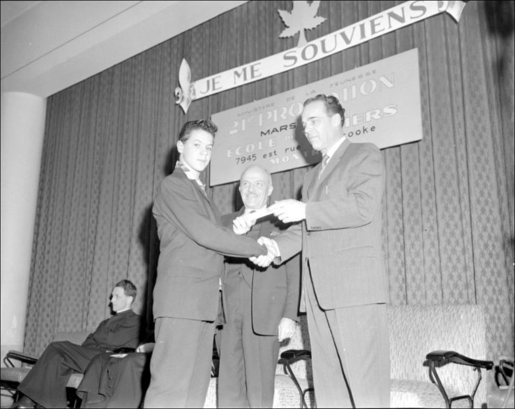 - Les finissants de la 21e promotion reçoivent leur diplôme. Une photographie de groupe complète le dossier. Reportage réalisé pour M. L. Saint-Arneault, directeur
