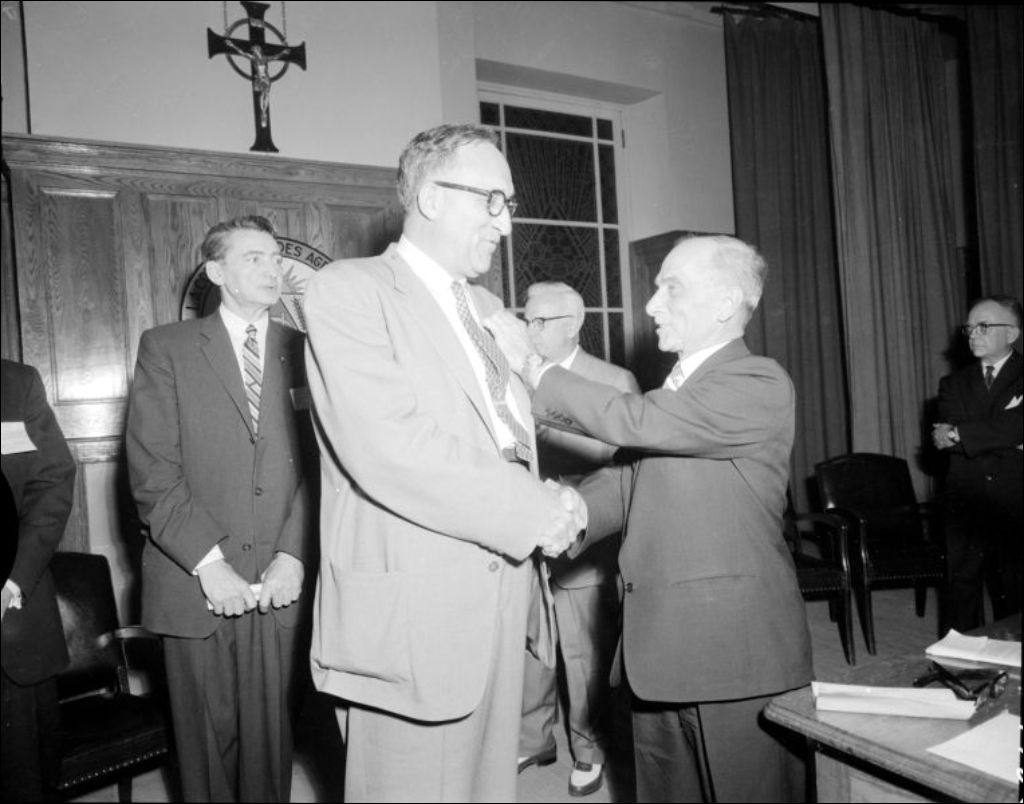 - Ce dossier présente, entre autres, l'Assemblée générale de la Corporation des agronomes de la province de Québec au collège Marie-Médiatrice. Un vin d'honneur est offert par la Cité de Hull. Le maire de la ville, Armand Turpin (E6,S7,SS1,P227197) et Érard Séguin (E6,S7,SS1,P227198), agronome et président du Comité de réception, souhaite la bienvenue aux confrères. Le président de la Corporation, M. W. H. Perron, prononce le discours d'ouverture (E6,S7,SS1,P227194 à E6,S7,SS1,P227196). Les conjointes des agronomes sont invités à une réception à l'Hôtel Wakefield Inn (E6,S7,SS1,P227200 à E6,S7,SS1,P227201) et à une promenade en autocar au Mont-King dans le Parc de la Gatineau (E6,S7,SS1,P227202 à E6,S7,SS1,P227205). Une seconde assemblée générale est donnée, cette fois, à la salle académique de l'Université d'Ottawa. Différents agronomes (E6,S7,SS1,P227190) sont décorés de l'Ordre du mérite agronomique: J. W. Delaney, qui reçoit son prix des mains du sénateur Henri-C. Bois (E6,S7,SS1,P227186), Conrad Turcot, qui reçoit, de son côté, son prix des mains de William Houde (E6,S7,SS1,P227200), Roland L'Espérance, récompensé par Gustave Taupin (E7,S7,SS1,P227188) et M. J-A. Sainte-Marie, absent pour l'occasion. Un confrère reçoit la décoration en l'honneur de ce dernier (E6,S7,SS1,P227188)