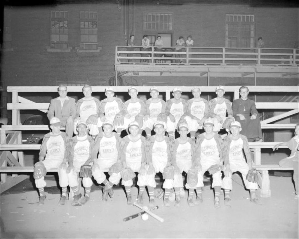 Partie de baseball et photo d'équipe au Patronage Jean-Léon le Prevost, devenu Patro le Prevost, à Montréal
