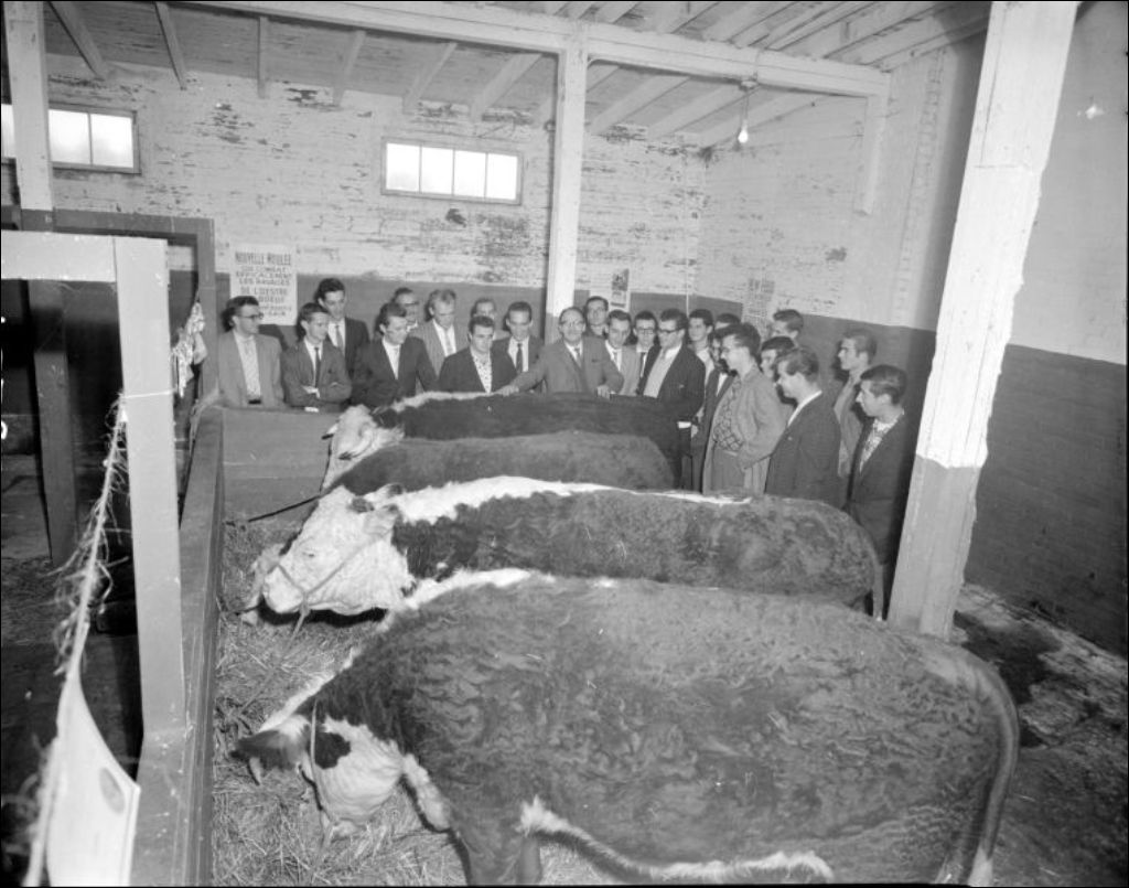 - Ce dossier présente, entre autres, un groupes d'étudiants avec M. Beaudel, agronome (E6,S7,SS1,P228234); le gagnant du concours provincial des jeunes éleveurs (E6,S7,SS1,P228235 à E6,S7,SS1,P228236); le grand champion, finale bovin (E6,S7,SS1,P228240; E6,S7,SS1,P228245) avec son propriétaire, Dr. McCall (E6,S7,SS1,P228238); un concurrent de la finale bovin (E6,S7,SS1,P228239); un taureau Aberdeen-Angus (E6,S7,SS1,P228241) avec son propriétaire, M.Smith (E6,S7,SS1,P228242); le taureau champion, catégorie Aberdeen-Angus et son propriétaire, David Jules (E6,S7,SS1,P228243); le taureau champion, catégorie Shorthorn (E6,S7,SS1,P228244); le bovin champion, catégorie Shorthorn (E6,S7,SS1,P228246), acheté par Canada Packers (E6,S7,SS1,P228254); le champion taureau de race Hereford (E6,S7,SS1,P228248 à E6,S7,SS1,P228249); le concours provincial des jeunes éleveurs (E6,S7,SS1,P228250 à E6,S7,SS1,P228251); le gagnant section jeunes éleveurs, catégorie veau (E6,S7,SS1,P228252); le champion, catégorie agneau de marché (E6,S7,SS1,P228255); le champion, catégorie porc, exposé par M. Fowler et acheté par la compagnie La Belle Fermière (E6,S7,SS1,P228256); un champion bovin, exposé M. Stuart et acheté par M. Eaton (E6,S7,SS1,P228257); un Aberdeen-Angus (E6,S7,SS1,P228258); un Hereford (E6,S7,SS1,P228259); trois Aberdeen-Angus achetés par Canada Packers (E6,S7,SS1,P228260); le grand champion, un bovin de race Aberdeen-Angus (E6,S7,SS1,P228262 à E6,S7,SS1,P228263). Sur le document E6,S7,SS1,P228262, ce dernier est accompagné, de gauche à droite, du Dr. McCall, de M. Hechel, du maire de la ville Sherbrooke, M. Nadeau, du gérant de la ferme de Bill Bross et de Pierre Labreque, du Service de l'industrie animal du gouvernement du Québec
