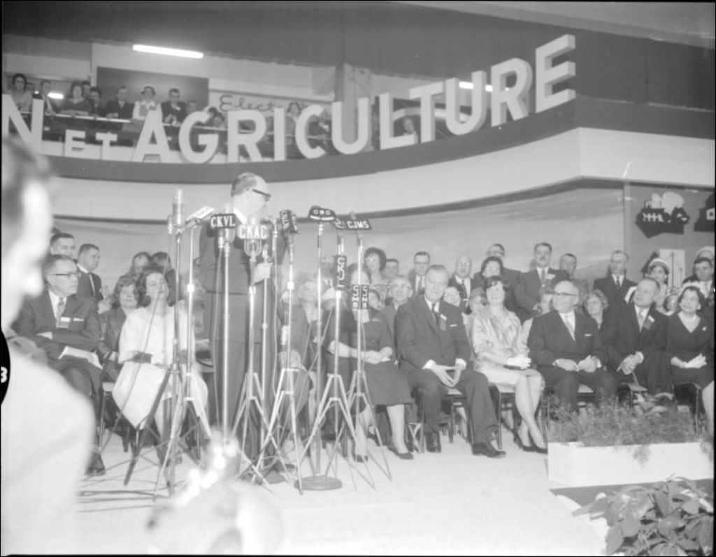 Ouverture du Salon national de l'agriculture, présenté au Palais du commerce, rue Berri à Montréal . Jean Lesage, premier ministre du Québec, Alcide Courcy, ministre de l'Agriculture et de la Colonisation et le maire de Montréal, Jean Drapeau, sont présents pour l'évènement
