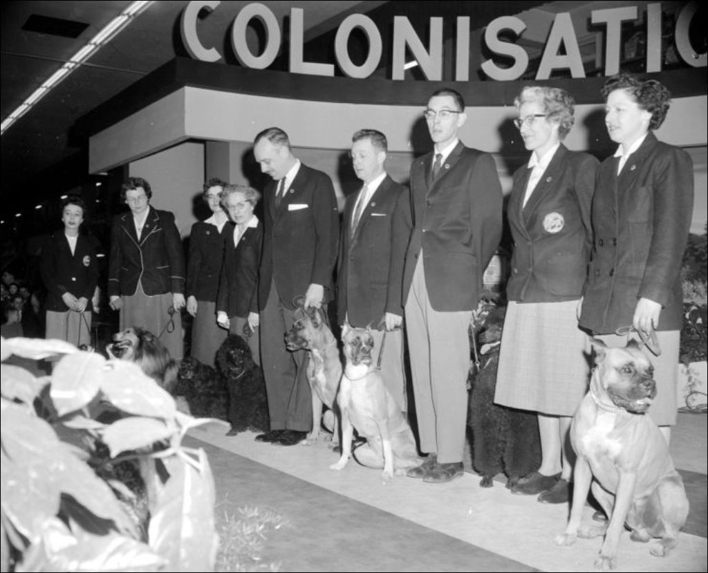 - Concours de chiens de dressage et remise de prix au Salon national de l'agriculture, présenté au Palais du commerce, rue Berri, à Montréal. Le ministre de la Jeunesse, Paul Gérin-Lajoie et le minstre de l'Agriculture et de la Colonisation, Alcide Courcy, sont présents pour l'occasion