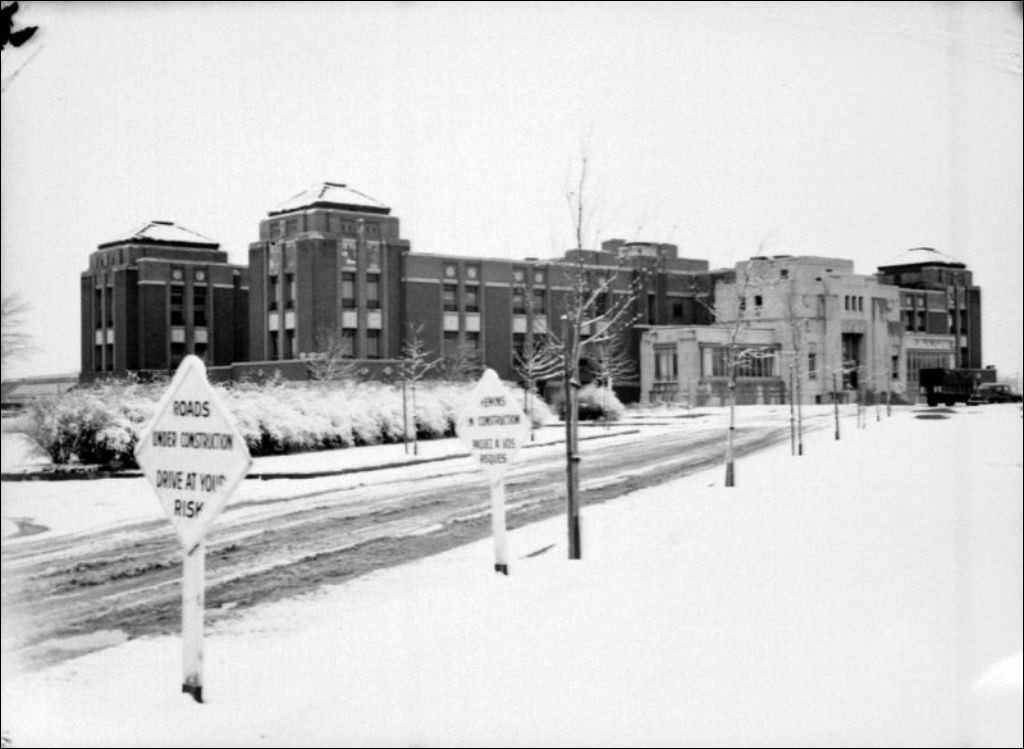 Vues du Jardin botanique de Montréal et du palais de Justice de Montréal situés respectivement sur la rue Sherbrooke Est et sur la rue Notre-Dame Est à Montréal. Nous apercevons le bâtiment administratif du Jardin botanique (E6,S7,SS1,P24180 et E6,S7,SS1,P24183) et la chaufferie (E6,S7,SS1,P24182) ainsi que le bâtiment du palais devenu l'édifice Ernest-Cormier (E6,S7,SS1,P24181)