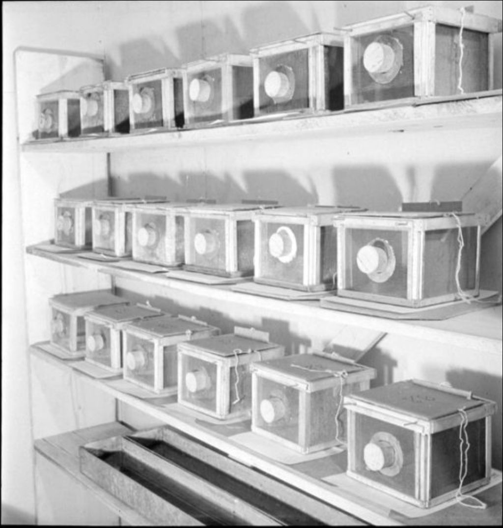 - Tests en laboratoire portant sur l'utilisation d'insecticide et réalisés au Laboratoire fédéral de fumigation D.D.T. de Montréal. Sur les images, nous remarquons l'équipement utilisé tel que les pompes pour la fumigation, les barils chargés d'insecticide et les cages à moustiquaire destinées aux insectes. Le dossier a été créé pour le Service de protection des plantes du ministère de l'Agriculture