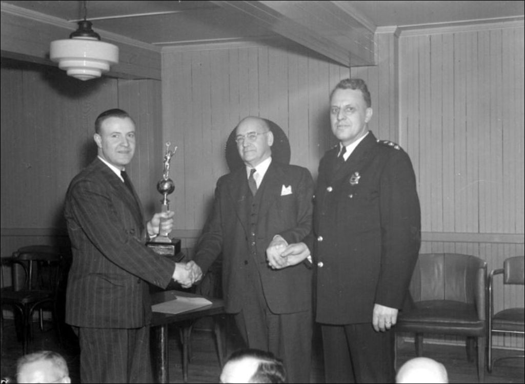 - Banquet au cours duquel ont lieu des remises de trophée. À cette occasion, Alcide Côté, maire de Saint-Jean, pose avec le chef de police Joseph Morin (E7,S7,SS1,P040185). Nous remarquons aussi la présence de Paul Beaulieu, député de Saint-Jean et ministre de l'Industrie et du Commerce en compagnie du maire de la ville (E6,S7,SS1,P040186). Enfin, les invités de marque sont réunis à la table d'honneur. Le dossier a été créé pour la Commission des incendies