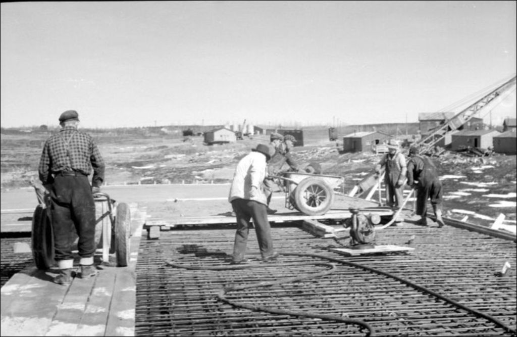 - Ce dossier représente le chantier de construction du pont Bell à Senneterre. Nous apercevons des grues mécaniques en opération et la structure métallique du tablier du pont. L'ensemble a été produit pour le Service des ponts du ministère des Travaux publics