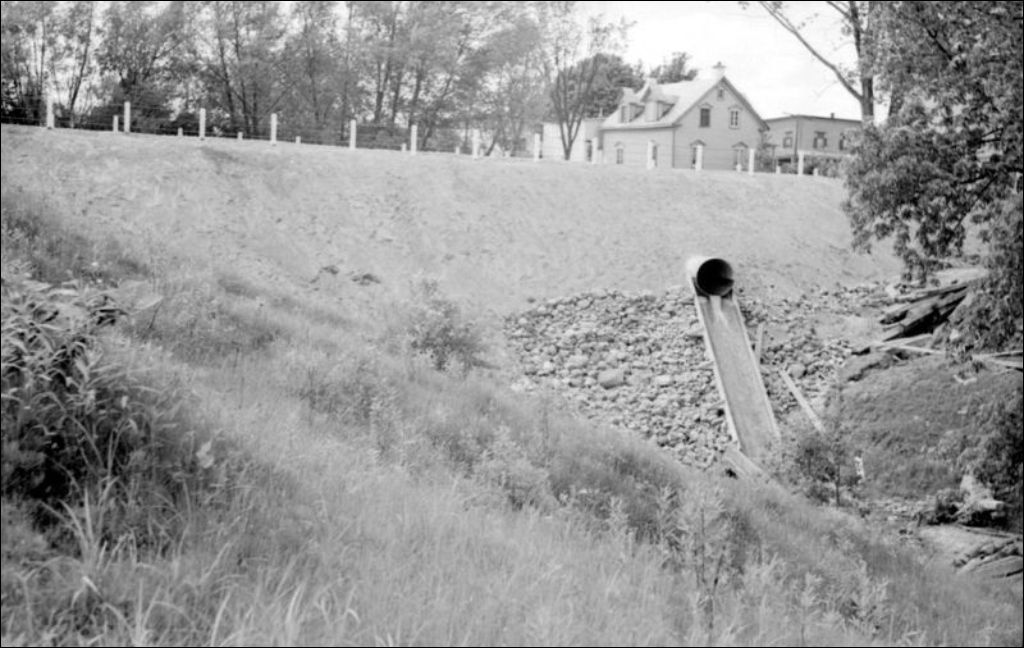 - Ces clichés représentent le pont de la Chaussée situé dans la paroisse de Saint-Roch-de-Richelieu. Nous apercevons le remblai, les tuyaux d'écoulement des eaux et quelques maisons des environs. Le dossier a été produit pour le Service des ponts du ministère des Travaux publics