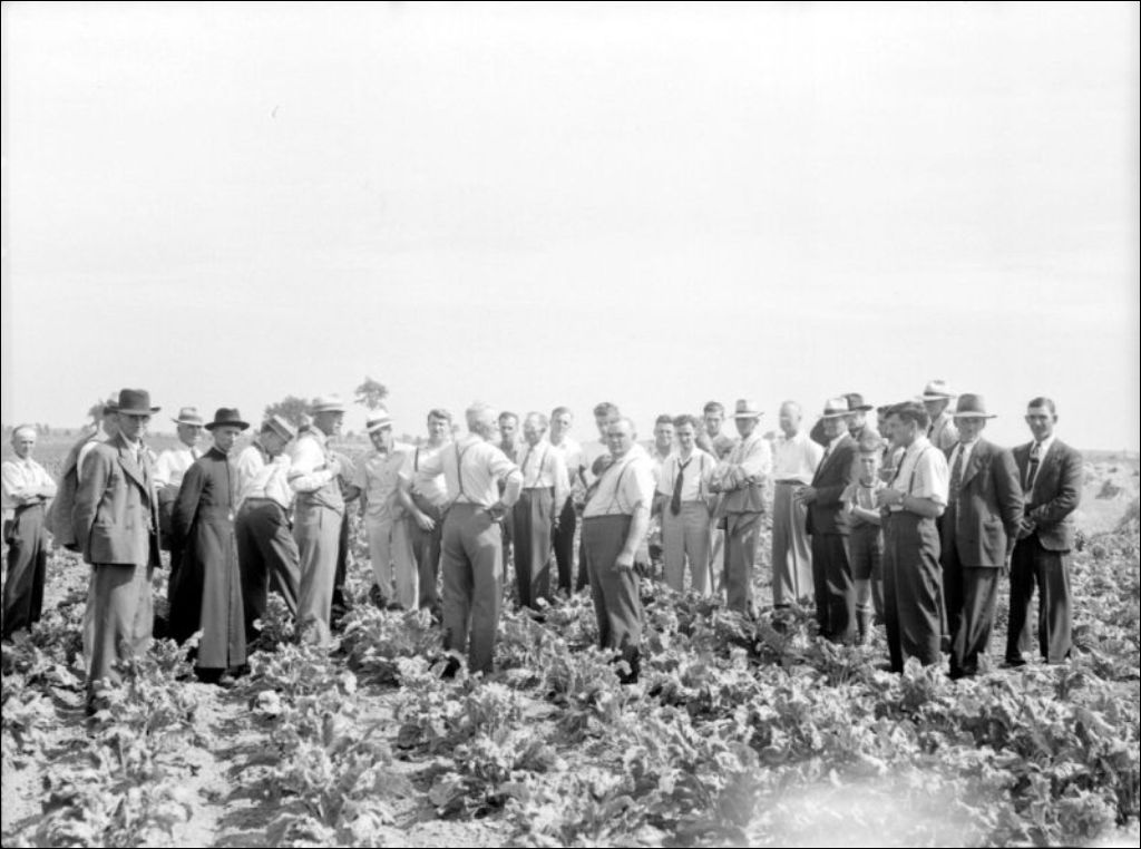 - Réunion des agronomes de la région de Saint-Jean. Le groupe est photographié dans un champ et devant un immeuble. Le dossier a été produit pour le Service d'horticulture du ministère de l'Agriculture