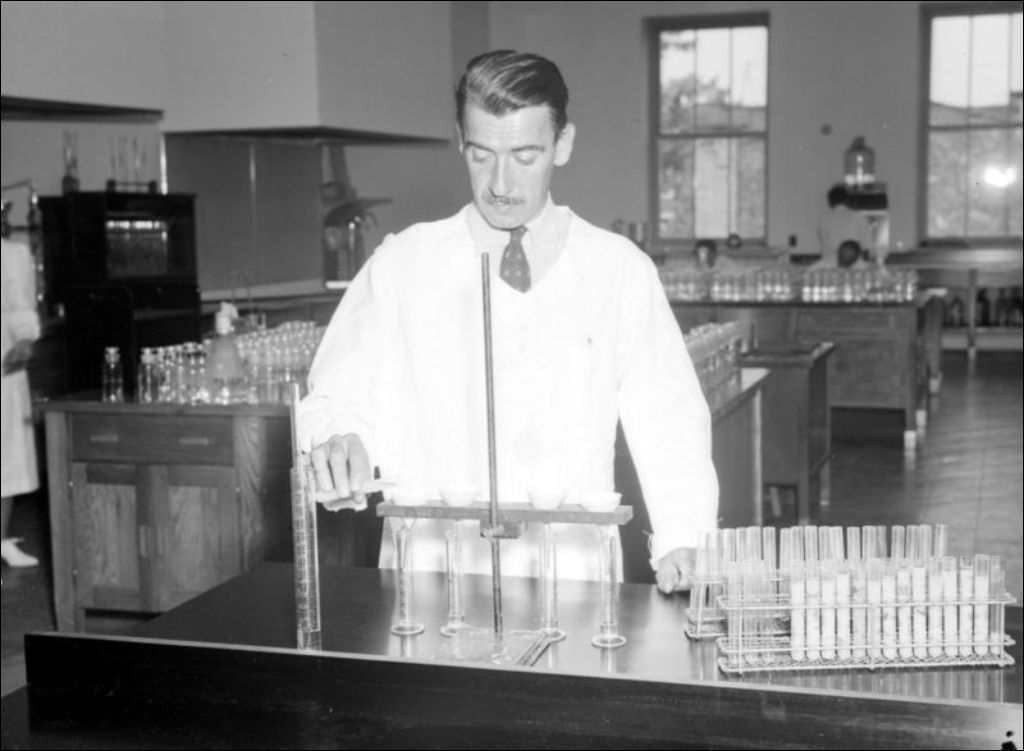 - Techniciens de laboratoire procédant à des tests de cultures bactériennes. Ce photo-reportage a été réalisé en vue de l'exposition de Québec pour le Service de laboratoire du docteur J. Archambault, ministère de la Santé