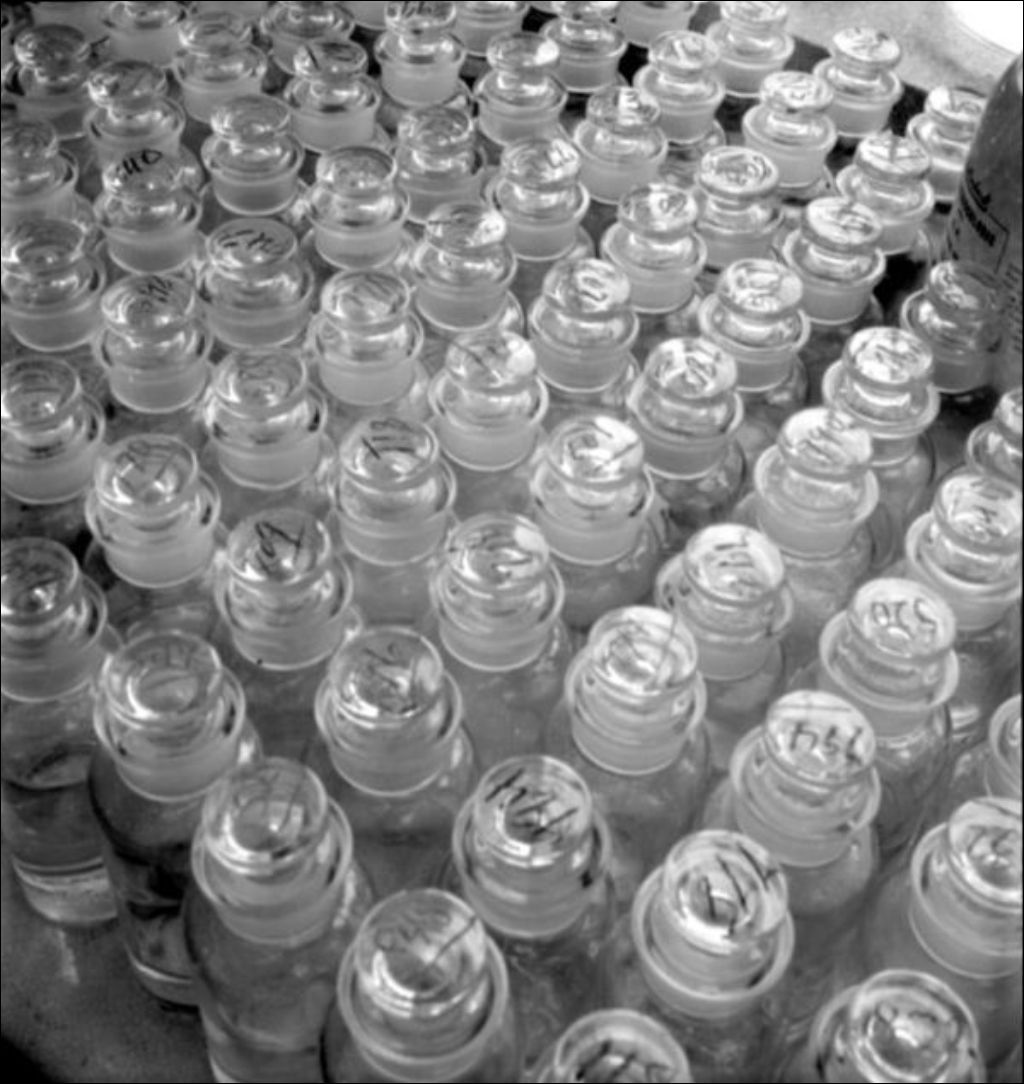 - Matériel utilisé pour réaliser des expériences de chimie en laboratoire : flacons de verre, appareil muni de béchers et de fioles (E6,S7,SS1,P041177). Ce photo-reportage a été réalisé en prévision de l'Exposition de Québec pour le Service des laboratoires, sous la direction du docteur J. Archambault, ministère de la Santé