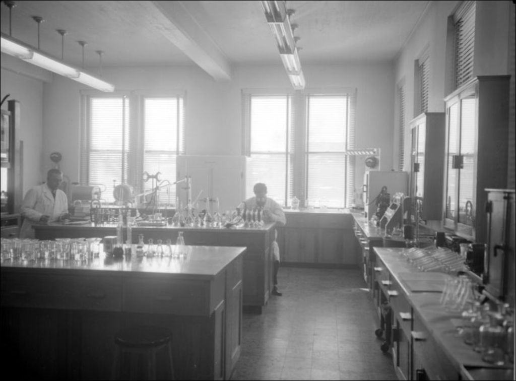 - Le dossier réunit des images portant sur un laboratoire où l'on remarque les instruments d'analyse utilisés par les chercheurs (les microscopes, les fioles et les éprouvettes); les employés au travail; le bureau du docteur Séguin (E6,S7,SS1,P042095); un patient alité sur une table d'examen (E6,S7,SS1,P042096). Le dossier a été produit pour le Service de l'hygiène industrielle du ministère de la Santé
