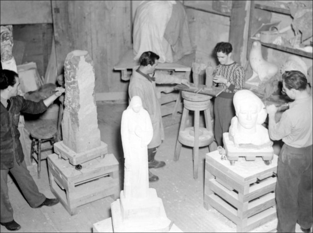 - Il s'agit d'un reportage sur l'École des beaux-arts située sur la rue Saint-Urbain à Montréal. Des étudiants travaillent dans un atelier de sculpture sur pierre (E6,S7,SS1,P042161). Ce dossier a été préparé pour l'École des beaux-arts et le Secrétariat provincial
