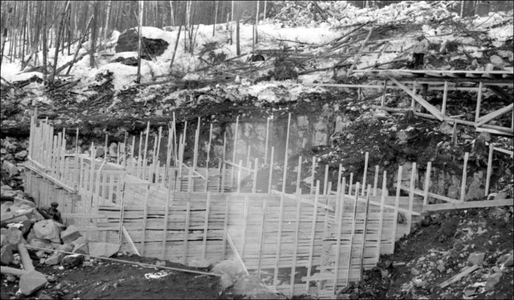 - Il s'agit du chantier de construction du pont de la rivière Camatose, situé dans le Réservoir Dozois, comté de Pontiac. On voit les échafaudages de même que la coulée de ciment (E6,S7,SS1,P042178). Ce dossier a été réalisé par le Service des ponts du ministère des Travaux publics