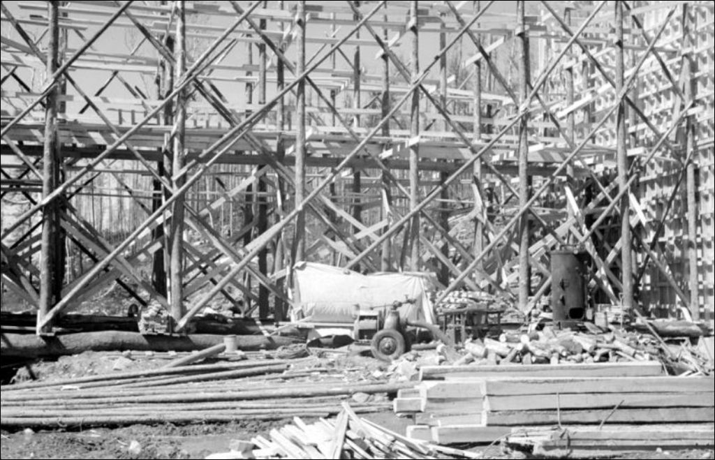 - Il s'agit du chantier de construction du pont de la rivière Camatose dans le réservoir Dozois, comté de Pontiac. Nous remarquons les échafaudages et les travaux de maçonnerie en cours. Ce dossier a été réalisé pour le Service des ponts, ministère des Travaux publics