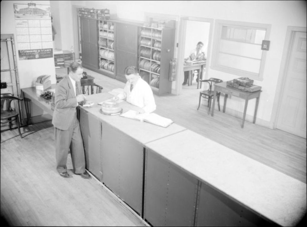 - Images portant sur le Service de ciné-photographie, bureau de Montréal. Un homme emprunte probablement des bobines de film. Ce dossier a été réalisé pour le Service de ciné-photographie, Conseil exécutif