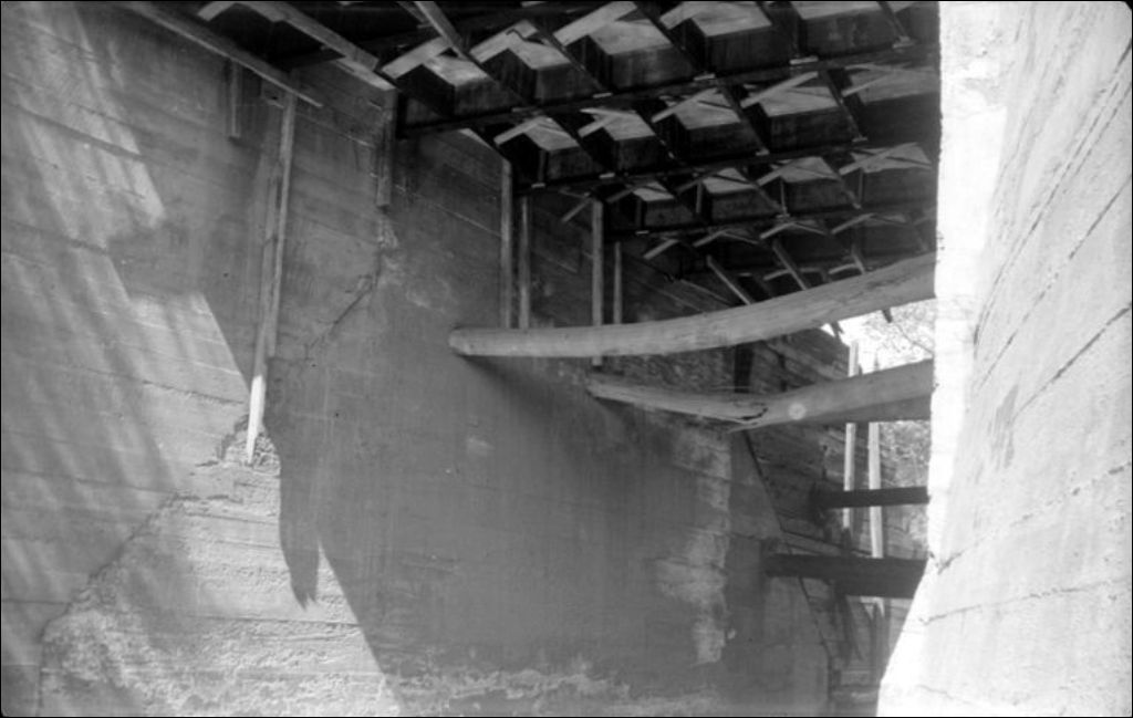 - Détérioration d'un pont situé sur la route de Parker's Station à Eardley. La structure est abimée par des fissures verticales dans les piliers de ciment et les poutres sont fendues et affaissées sous la structure du tablier. Dossier créé pour le Service des ponts, ministère des Travaux publics