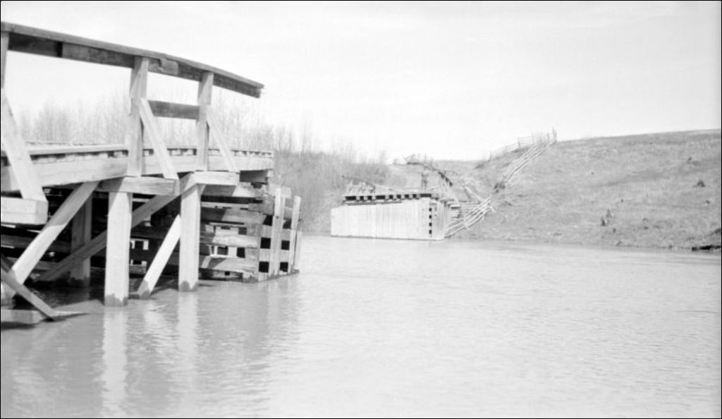 - Parmi les ponts à rénover, nous remarquons le pont couvert de la rivière Dagenais à Palmarolle en Abitibi (E6,S7,SS1,P042511), un pont désaffecté de la région (E6,S7,SS1,P042509), le pont du ruisseau Panache à Amos (E6,S7,SS1,P042512) et le pont de la rivière des Peupliers à Senneterre qui a été inondé par les crues (E6,S7,SS1,P042514). Un coupé sport Oldsmobile tente de traverser le pont submergé (E6,S7,SS1,P042513). Ce reportage-photo a été exécuté pour le Service des ponts, ministère des Travaux publics