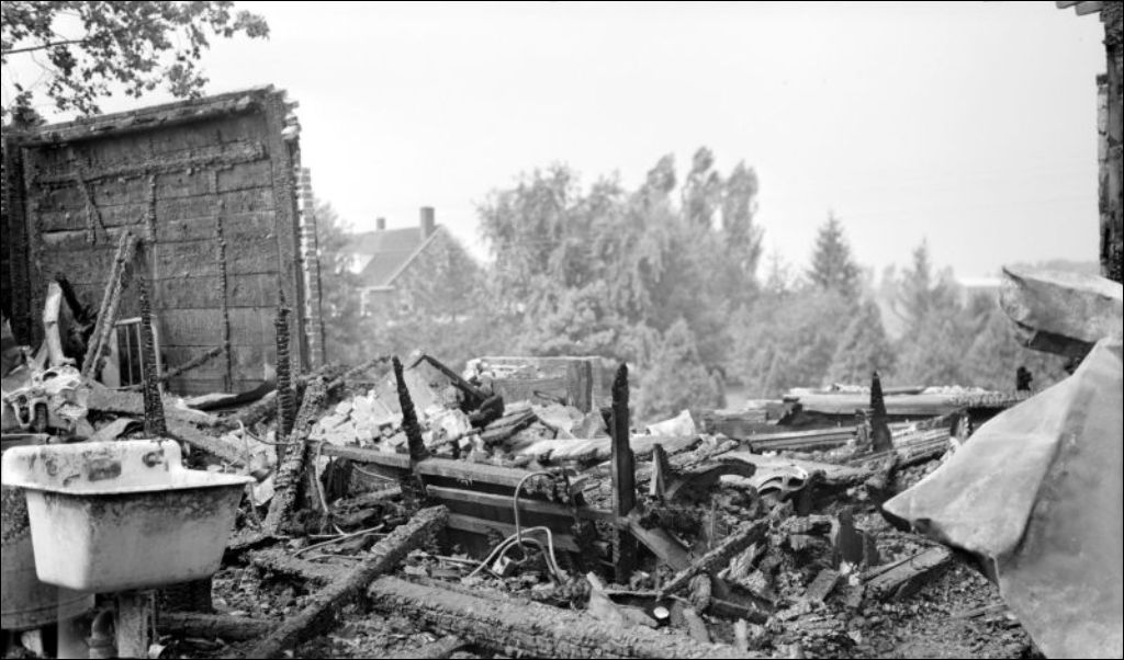 - Site sinistré où l'on retrouve les décombres d'un garage en grande partie incendié. Situé en face du restaurant Mon oncle Olivier dans la municipalité de l'Assomption, l'édifice appartenait à Origène Bruneau. Le reportage a été mené pour le Commissariat des incendies de la province et le ministère des Travaux publics
