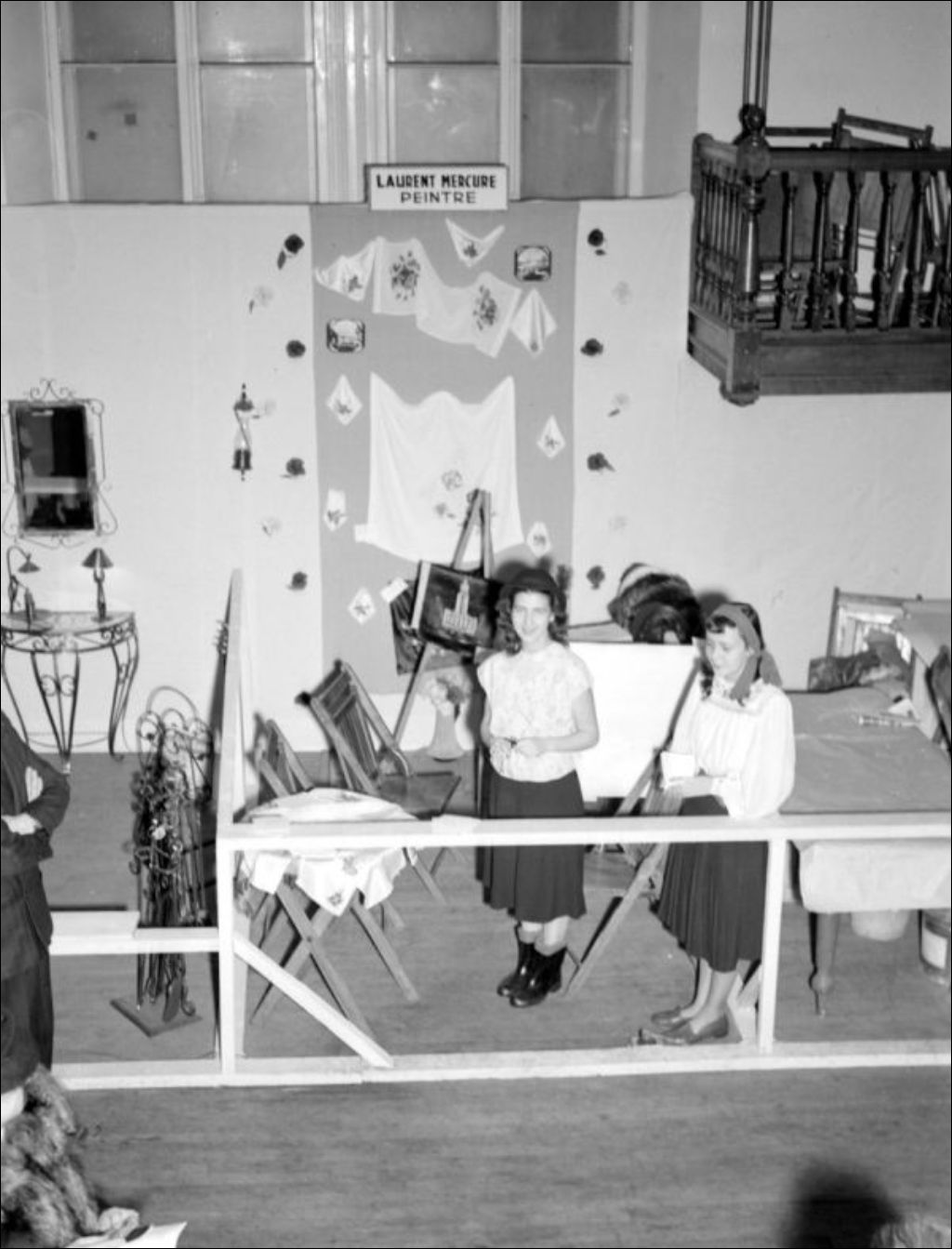 - Exposition artisanale de la paroisse de l'Immaculée-Conception à Montréal organisée par le ministère de l'Industrie et du Commerce et l'Office provincial de l'artisanat et de la petite industrie dont nous remarquons le kiosque (E6,S7,SS1,P043503). Plusieurs exposants sont présents. Nous remarquons les étalages identifiés au nom de la boutique ou de la petite entreprise. L'École du meuble de Montréal (E6,S7,SS1,P043501) participe à l'événement fréquenté par des groupes scolaires (E6,S7,SS1,P043499). Nous retrouvons des produits artisanaux illustrant divers métiers d'arts : peinture, photographie, radio, fabrication de télescopes, ferronnerie d'art, décoration intérieure, peinture à l'aiguille et travaux de cuir repoussé. Le dossier a été produit pour l'Office de l'artisanat et le ministère de l'Industrie et du Commerce