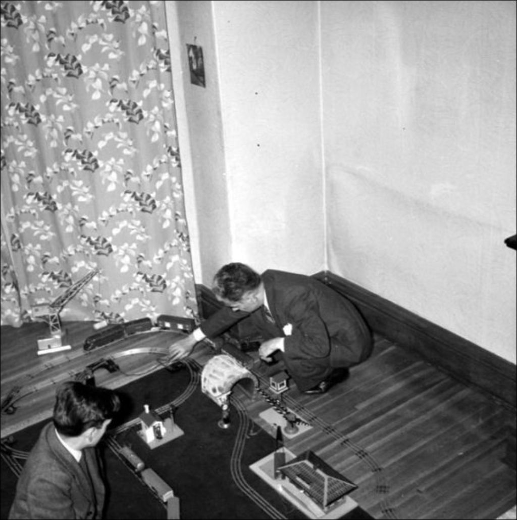 Monsieur Eykel, en compagnie de son fils de 14 ans, actionne des modèles réduits de trains. Image prise pour la Revue technique, le Service de publicité et le ministère de la Jeunesse