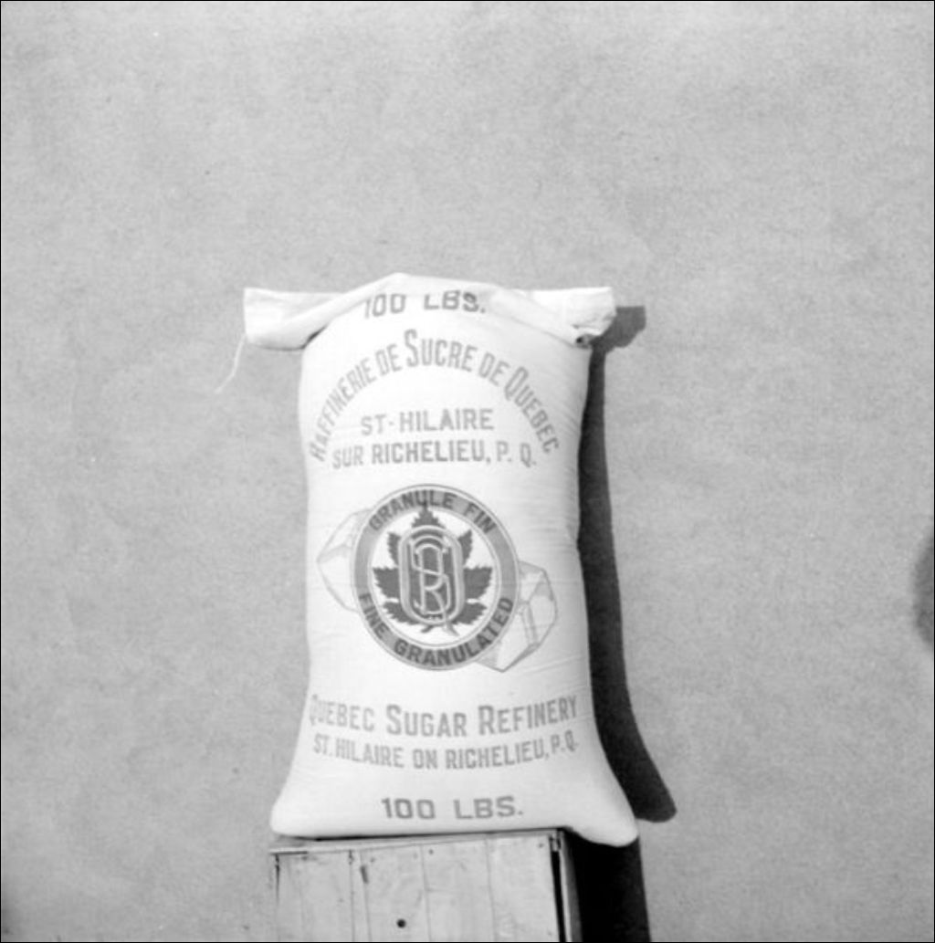 Produits mis en marché par la Raffinerie de sucre de Québec située à Saint-Hilaire-sur-Richelieu (devenu Mont-Saint-Hilaire). Il s'agit d'un sac de 100 livres de sucre granulé fin et d'un sac de 100 livres de pulpe de betterave séchée produit par la raffinerie de betteraves à sucre. Image réalisée pour le Service de l'information, ministère de l'Agriculture