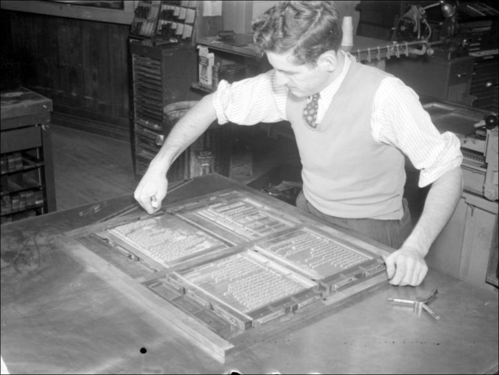 - Il s'agit d'images prises dans le cadre des cours offerts par l'École des arts graphiques, rue Kimberley à Montréal. Nous voyons une presse à imprimerie (E6,S7,SS1,P043714), une machine à plier servant à la reliure (E6,S7,SS1,P043715 à E6,S7,SS1,P043721 et E6,S7,SS1,P043723) et un typographe assemblant les lettres d'un texte (E6,S7,S1,P043722). Ce dossier a été réalisé pour l'École des arts graphiques, ministère de la Jeunesse