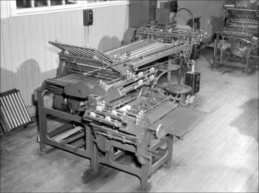 - Images témoignant des activités réalisées par les étudiants de l'École des arts graphiques située sur la rue Kimberley à Montréal. Nous voyons une presse d'imprimerie (E6,S7,SS1,P043724), une machine à plier servant à la reliure (E6,S7,SS1,P043725 et E6,S7,SS1,P043732), un étudiant affairé à la composition des textes (E6,S7,SS1,P043727 et E6,S7,SS1,P043730), une linotype (E6,S7,SS1,P043729) et un linotypiste au travail (E6,S7,SS1,P043733) et une monotype (E6,S7,SS1,P043731). Ce dossier a été réalisé pour l'École des arts graphiques, ministère de la Jeunesse