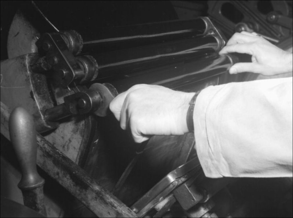 - Il s'agit de clichés pris à l'École des arts graphiques située sur la rue Kimberley à Montréal. Nous remarquons la machinerie, parmi laquelle se trouvent une presse d'imprimerie et divers outils utilisés lors des opérations d'impression et de reliure. Un typographe assemble les caractères d'impression destinés au montage d'un texte (E7,S7,SS1,P043752) et un apprenti s'affaire à centrer une page de journal (E6,S7,SS1,P043753). Ce dossier a été réalisé pour l'École des arts graphiques, ministère de la Jeunesse