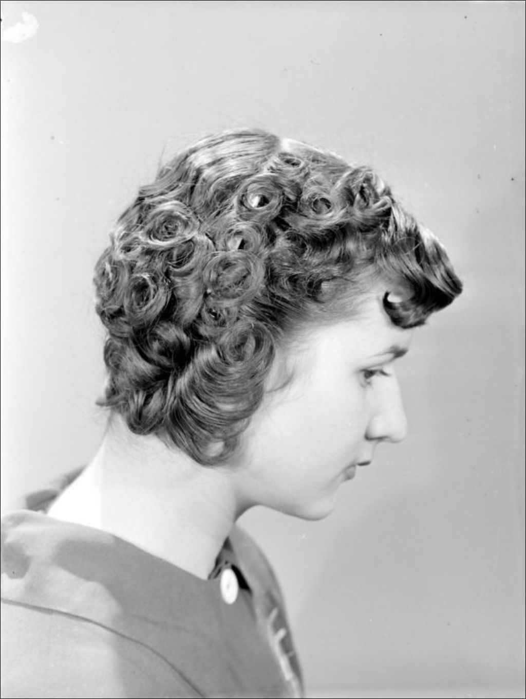 Mises en plis réalisées par les étudiant(e)s de l'École centrale d'arts et métiers située sur la rue Saint-Denis à Montréal. Des modèles présentent différents styles de coiffures féminines en vogue au cours des années d'après-guerre. Elles sont surtout faites de boucles et de vagues. Dossier préparé pour l'École centrale d'arts et métiers, ministère de la Jeunesse
