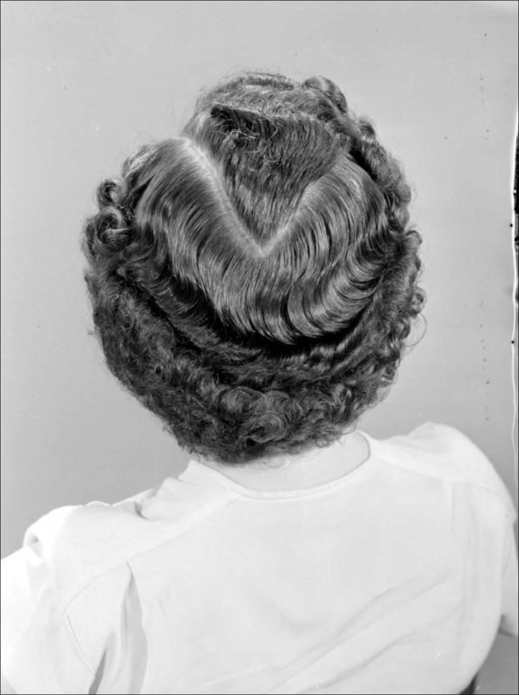 - Modèles présentant des coiffures féminines en vogue dans les années d'après-guerre. Les mises en plis ont été réalisées par les étudiant(e)s de l'École centrale d'arts et métiers, rue Saint-Denis à Montréal. Ce dossier a été préparé pour l'École centrale d'arts et métiers et le ministère de la Jeunesse