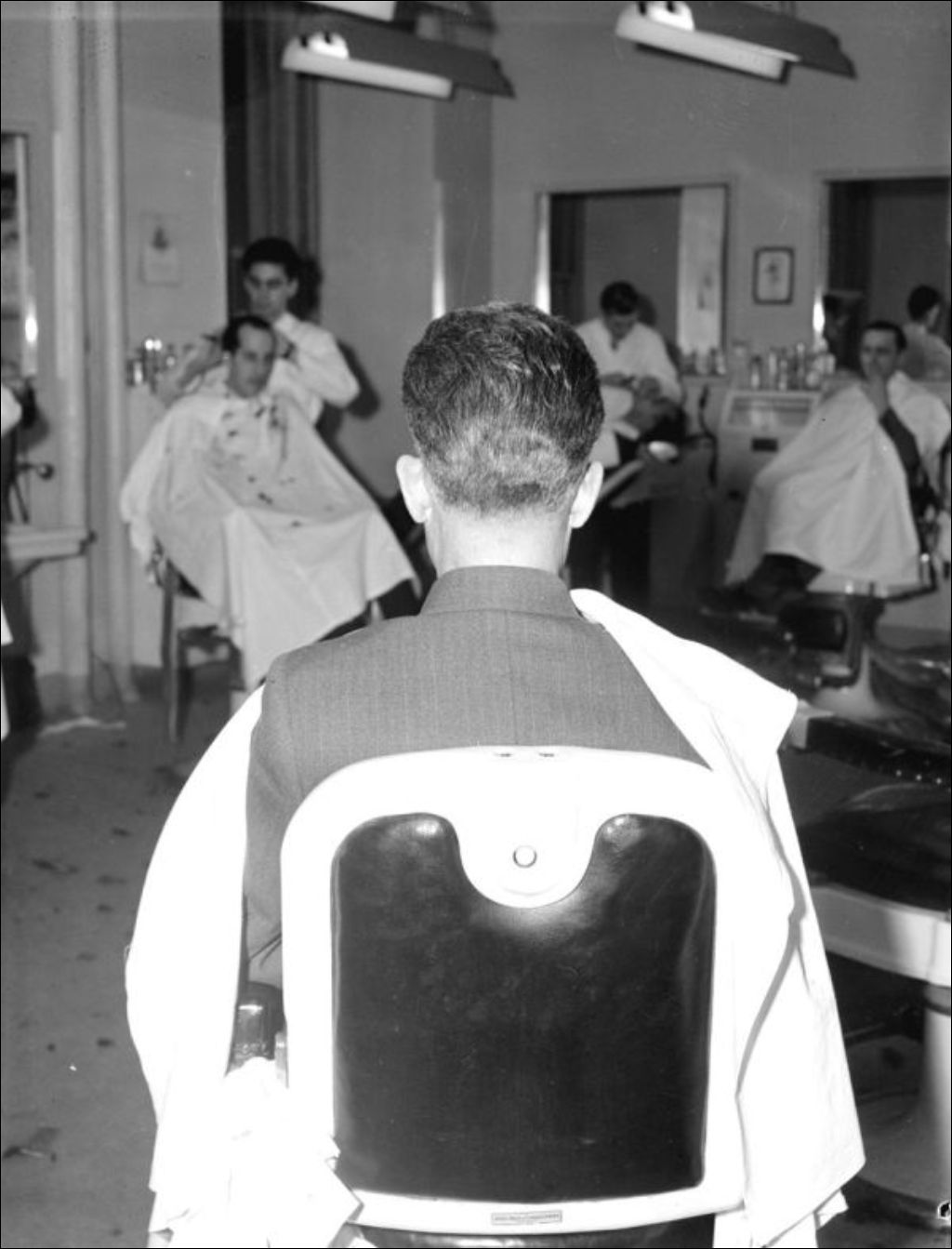 - Modèles masculins présentant des coupes réalisées par les apprentis barbiers de l'École centrale d'arts et métiers de la rue Saint-Denis à Montréal. Le dossier a été réalisé pour l'École centrale d'arts et métiers et le ministère de la Jeunesse