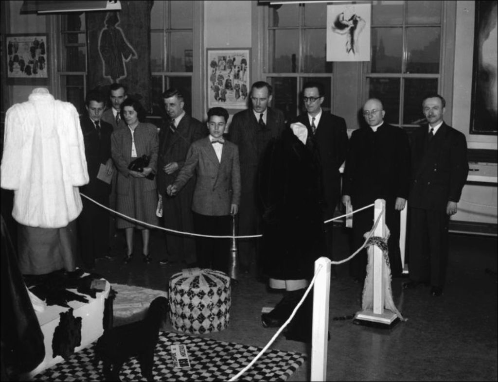 - Échantillons de travaux en haute couture présentés lors d'une exposition tenue à l'École centrale d'arts et métiers, rue Saint-Denis à Montréal. Nous remarquons les visiteurs admirant les manteaux de fourrures, robes de soirée et chaussures réalisés par les étudiants. Les murs sont ornés de croquis de mode. Images prises pour l'École centrale d'arts et métiers, ministère de la Jeunesse