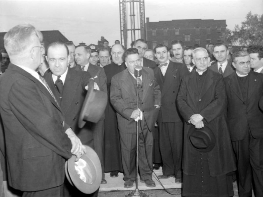 - Inauguration d'une nouvelle succursale de l'École des arts et métiers située dans le quartier Saint-Henri à Montréal. L'événement est marqué par la présence du ministre, J.-H. Delisle. Le politicien s'adresse à l'assemblée et soulève la première pelletée de terre. Images prises pour le Service de l'information et le ministère du Bien-Être social et de la Jeunesse