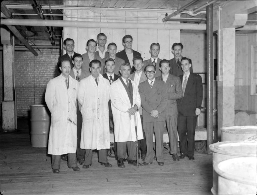 Visiteurs reçus aux abattoirs de l'École supérieure d'agriculture de Sainte-Anne-de-la-Pocatière. Image réalisée pour le Service de l'information du ministère de l'agriculture