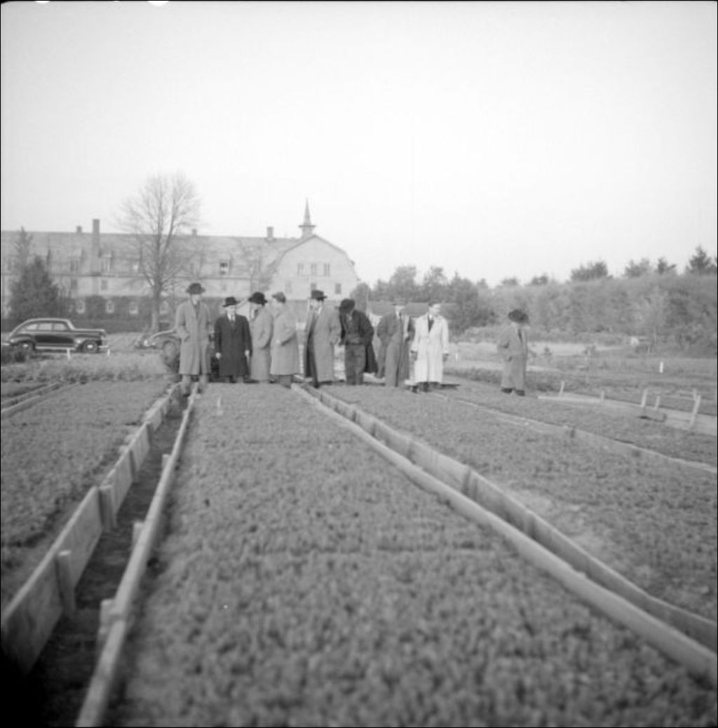 - Groupe d'agronomes en visite dans une pépinière située à Berthierville. Ils déambulent parmi les haies de sapins (E6,S7,SS1,P046434) et d'épinettes (E6,S7,SS1,P046438). Quelques ouvriers séparent de jeunes pousses (E6,S7,SS1,P046436) pour la transplantation. Ce dossier a été préparé pour le Service de l'information du ministère de l'Agriculture